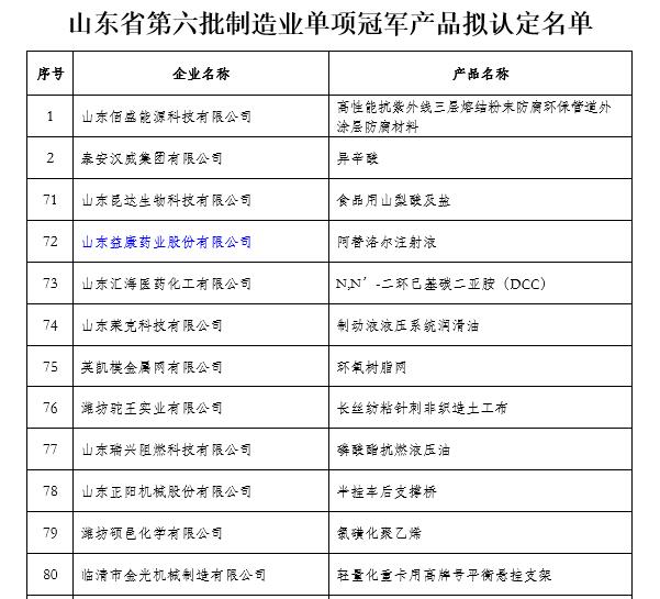 山東益康集團 > 集團新聞集團新聞公司產(chǎn)品阿替洛爾注射液被認定為山東省制造業(yè)單項冠軍產(chǎn)品近日,省工業(yè)和信息化廳、省工業(yè)經(jīng)濟聯(lián)合會(huì )公示了第六批山東省制造業(yè)單項冠軍擬認定名單和第三批復核擬通過(guò)名單。山東益康藥業(yè)股份有限公司的產(chǎn)品阿替洛爾注射液被認定為山東省制造業(yè)單項冠軍產(chǎn)品。