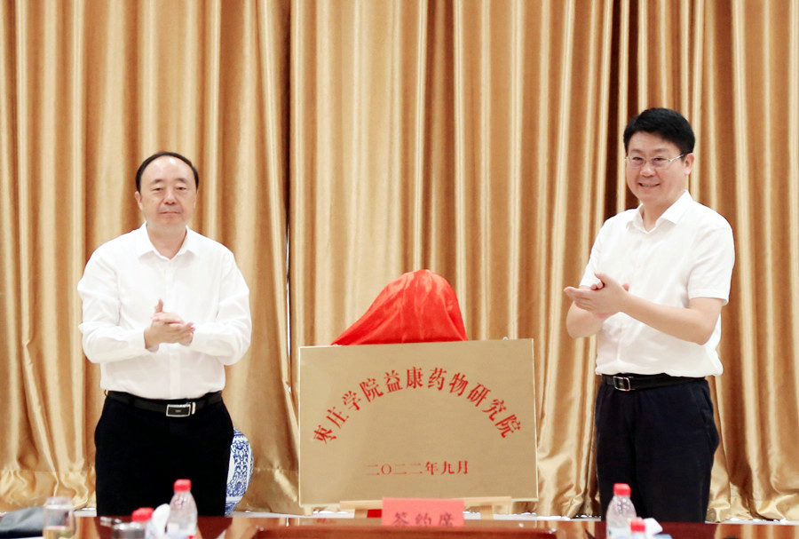 王洪齡院長(cháng)與楊青霖局長(cháng)共同為“棗莊職業(yè)學(xué)院益康產(chǎn)業(yè)學(xué)院”揭牌