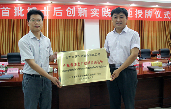 山東益康集團 > 集團新聞集團新聞益康藥業(yè)“全省首批博士后創(chuàng )新實(shí)踐基地”授牌儀式舉行8月20日,山東益康藥業(yè)“全省首批博士后創(chuàng )新實(shí)踐基地”,經(jīng)省人社廳正式授牌。益康藥業(yè)成為棗莊市僅有的兩家入選單位之一,也是我市設立的首家博士后創(chuàng )新實(shí)踐基地,填補了我市省級博士后工作平臺的空白,成為我市促進(jìn)人才引進(jìn)培養、產(chǎn)學(xué)研結合的又一重要載體。棗莊市人社局副局長(cháng)王振到企業(yè)授牌,南沙河鎮黨委副書(shū)記、鎮長(cháng)周琪參加授牌儀式。王振對益康藥業(yè)的人才隊伍建設、科研平臺建設、技改投資等方面的工作給予高度評價(jià),要求企業(yè)落實(shí)好博士后創(chuàng )新實(shí)踐基地各項工作任務(wù),早日建成國家級博士后工作站。